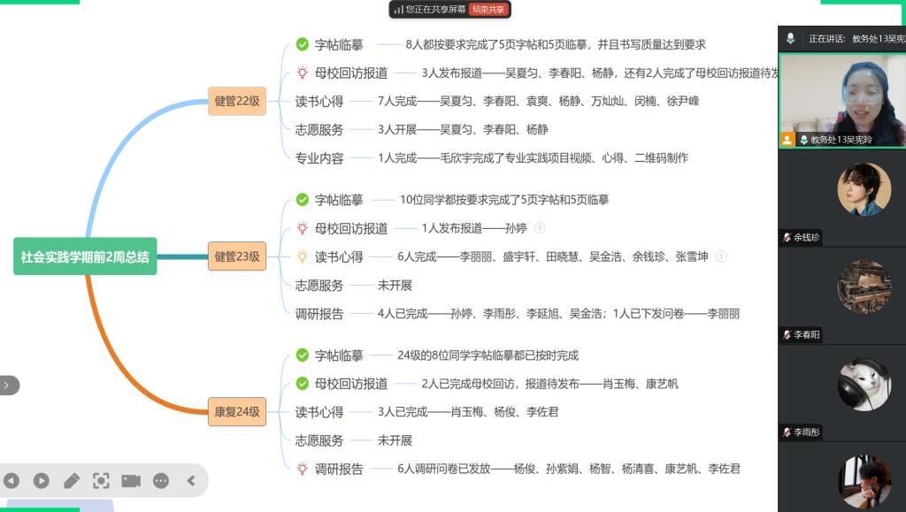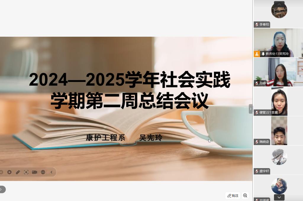 1月18日晚,生涯导师吴宪玲老师在腾讯会议主持召开了社会实践学期第二周总结会议。此次会议旨在回顾社会实践学期前两周的成果,总结经验教训,并为后续的工作指明方向。健康管理专业22级、23级以及康复专业24级的共26名同学参加了此次会议。