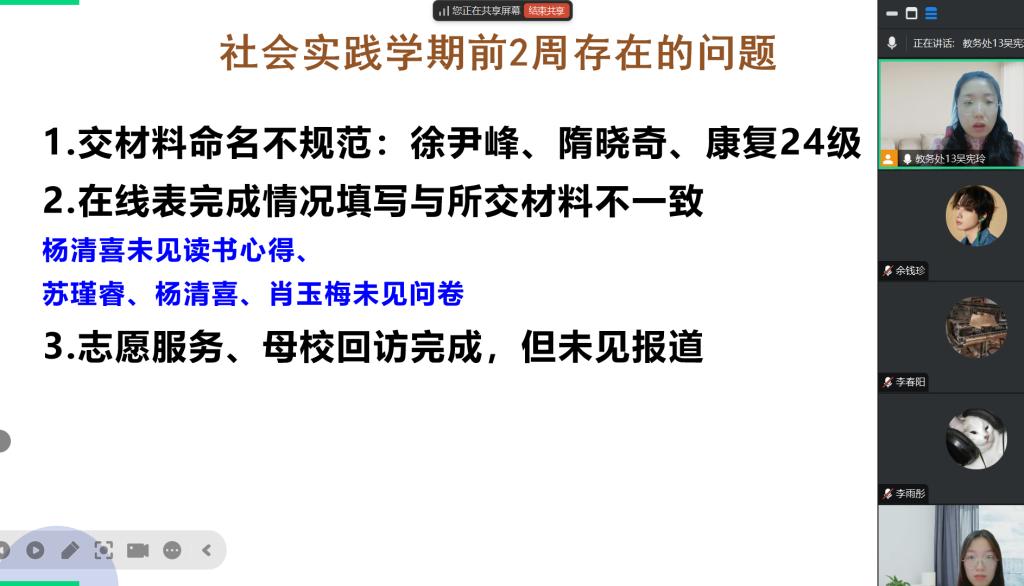 接着,吴老师总结了前两周提交材料中存在的共性问题,如提交材料命名格式不规范,志愿服务与母校回访完成、但报道不及时,字帖临摹数量不够等,并给出了具体的改进建议。她强调,同学们在撰写社会实践调研报告时,要注重细节,力求内容详实、条理清晰、数据支撑。
