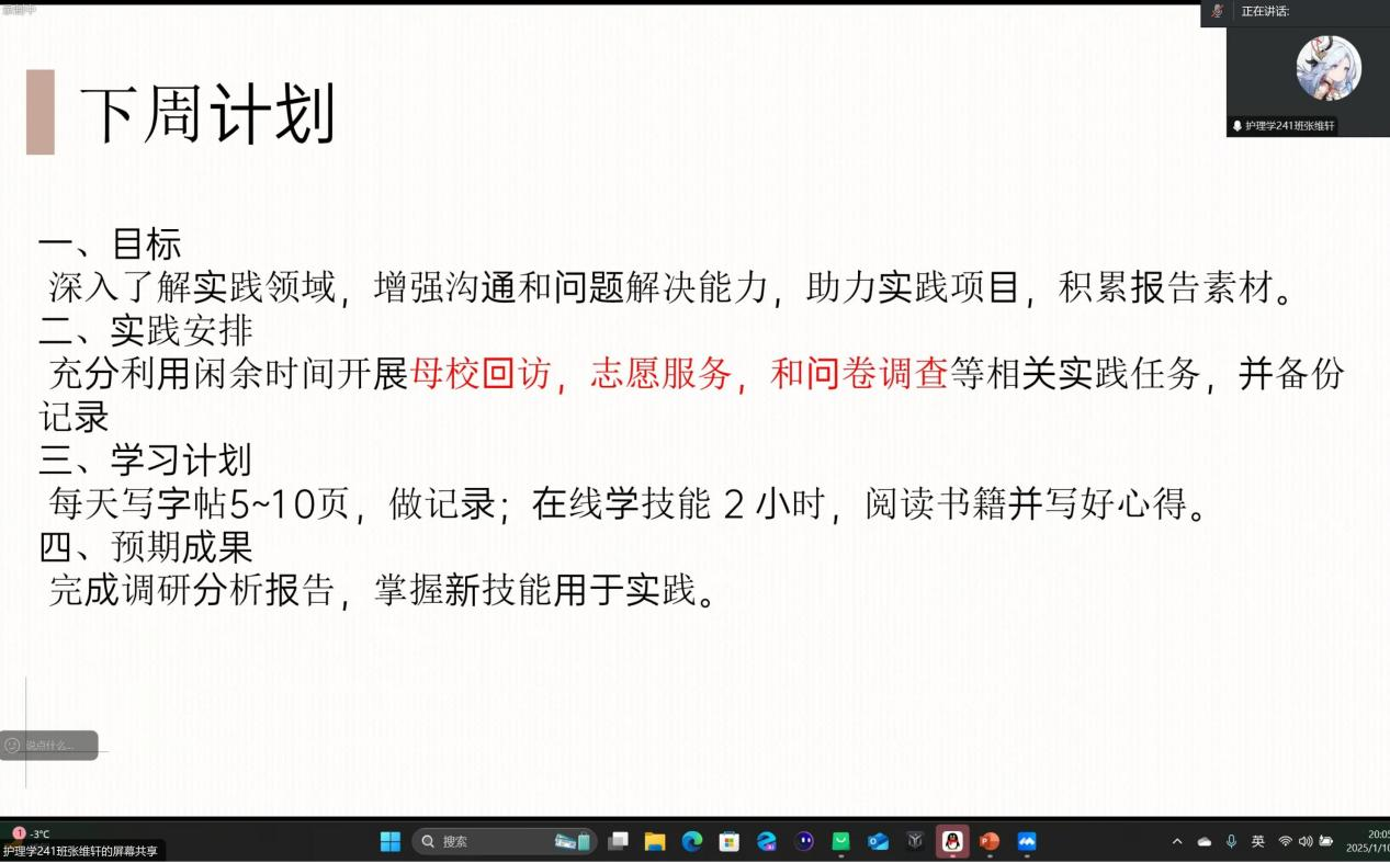 2025年1月10日晚20:00,为更好推进社会实践学期工作,深入了解学生相关项目进展,KHX-079至KHX-084组借助腾讯会议平台,举办了社会实践学期第一周总结会议。此次会议由王悦同学主持,指导老师曹慧全程参与并悉心指导,该六个小组的23名同学全员到会。