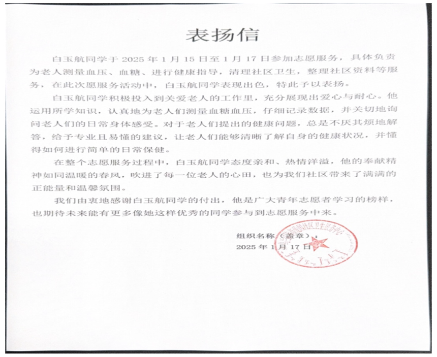 这段志愿服务经历,如同一束光,照亮了我成长的道路。我不仅为社区带来积极改变,更在过程中收获了责任与担当。未来,我将带着这份温暖与力量,继续在志愿服务中发光发热,为社区、为社会贡献更多力量。