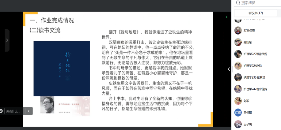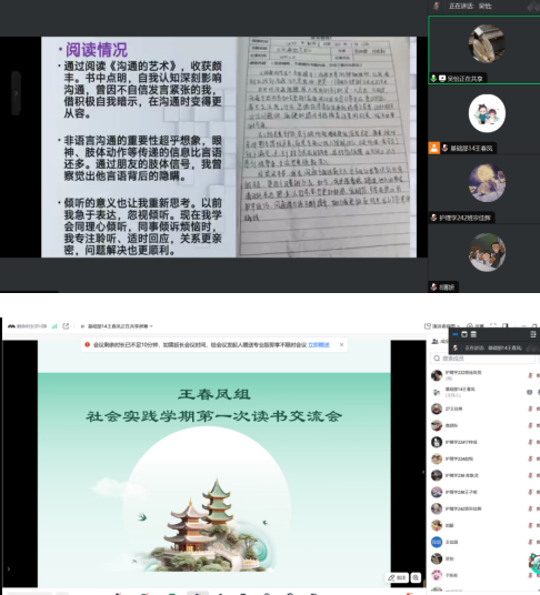 此前,各组同学历经两周时间,均圆满完成了社会实践学期第一本书的阅读。为了充分交流阅读内容、分享读书心得,进一步点燃大家的阅读热情,本次交流活动应运而生。活动筹备期间,各组精心制作了PPT,并选派组内的优秀成员作为代表,在会上进行汇报交流 。