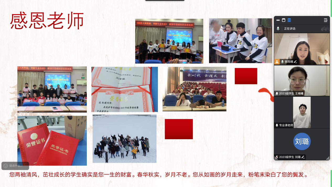 活动伊始,陈雨晴怀着对母校的感恩之心,在精心制作的PPT中展示了母校的校园风光、曾经的课堂场景,唤起了参会师生们的美好回忆,表达了对母校教育培养的深深感激。