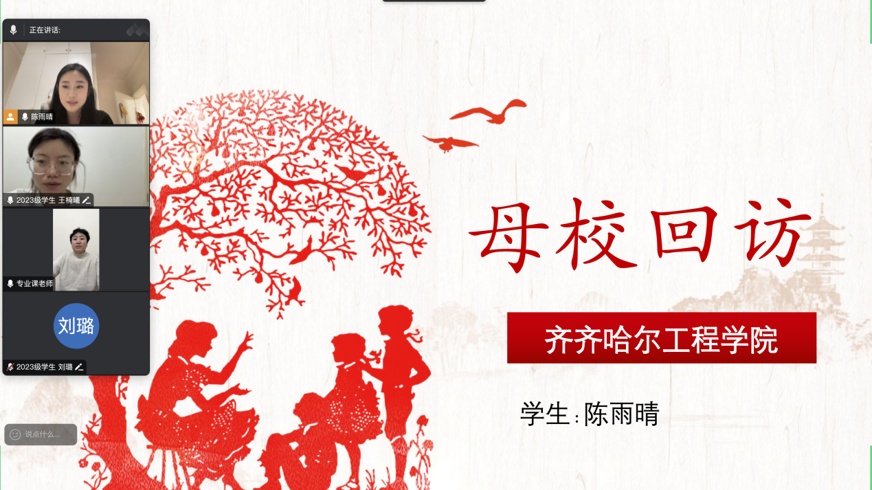 在2025年1月17日下午,一场充满温情的线上“母校回访”活动于腾讯会议平台温馨开展。此次活动由陈雨晴主持并积极组织,在向培育自己的母校遥寄感恩之情,重叙往日深厚情谊。