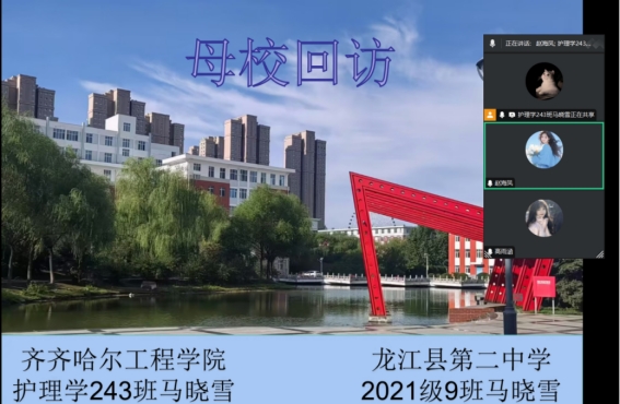 通过视频会议与母校的老师亲切问候,仿佛再次回到了那个熟悉而温馨的校园。随后,我分享了在大学的学习生活经历,从高考志愿的选择到大学生活的适应。校园环境优美,绿树成荫,湖泊点缀其间,为学习生活带来宁静与惬意。宿舍生活温馨和睦,室友们的友谊成为大学时光中最珍贵的回忆。