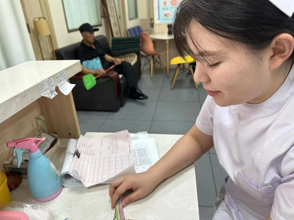 在六合卫生所,她积极投入志愿服务。在协助医生的过程中,专注地帮助医生撕取所需物品,为医疗工作的有序开展贡献力量。从整理资料到协助准备医疗用品等各项小事,她都认真负责,以实际行动诠释着志愿服务精神。她的付出不仅为医生减轻了工作负担,也为患者营造了更高效的就医环境,得到了医护人员和患者的一致认可。