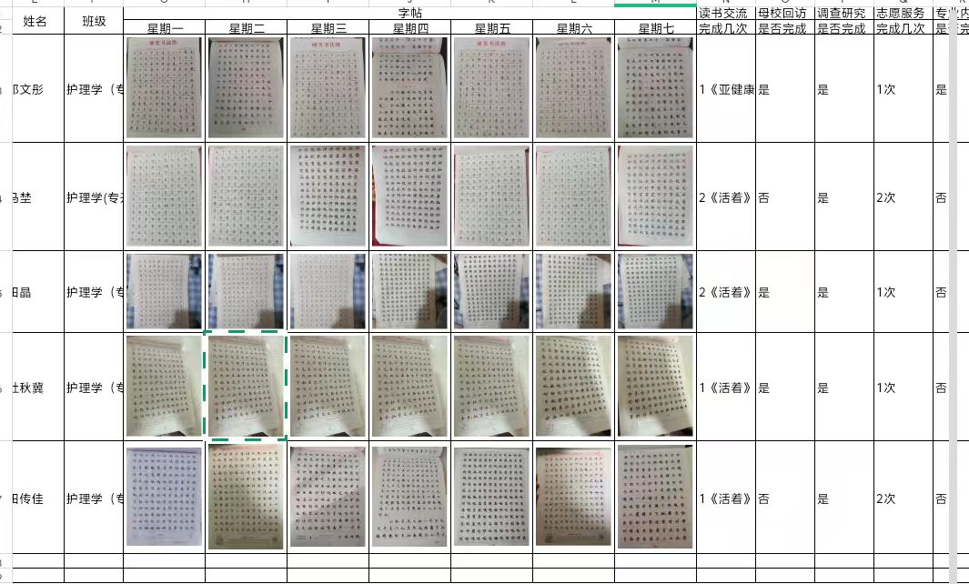 在字帖临摹、读书交流、母校回访等任务中,同学们表现出色。字帖临摹方面,多数同学完成每日任务,邓文彤同学一周坚持临摹,字迹工整、进步明显,马埜同学成果获老师肯定;读书交流活动里,不少同学完成社区推荐书籍阅读,田晶同学读完《活着》撰写深刻感悟,分享对生命意义的思考,田传佳同学阅读《亚健康中医疗法》并与小组交流心得,带动健康话题讨论;母校回访任务中,同学们积极联系母校老师组织活动,大部分同学顺利完成,分享学习经验,为学弟学妹提供宝贵意见。调查研究与志愿服务活动有序开展,部分同学在社区开展居民健康需求调查,为后续志愿服务提供方向;另有同学多次参与社区志愿服务,如帮助老年人进行健康检查等,展现良好社会责任感。