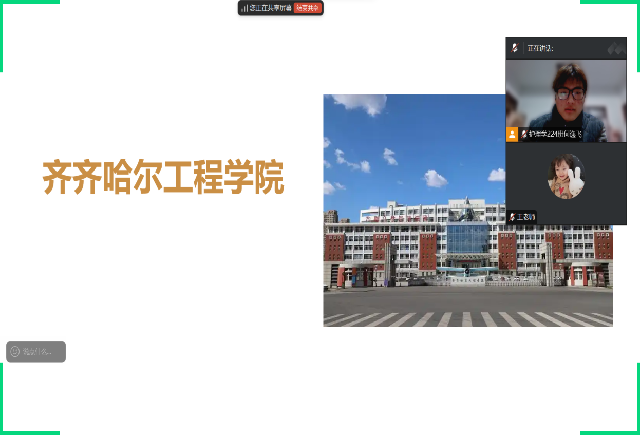 张若彤同学在此次活动中,她为大家进行线上腾讯会议宣讲,每个同学都很热情地向她提问。在宣传学校让学弟学妹了解齐齐哈尔工程学院,并鼓励他们关注和报考之余,她又播放了一段在齐工程的大学生活片段vlog,让同学们更加深入了解了真正大学生活是什么样,使他们对大学有了更多的憧憬与遐想。