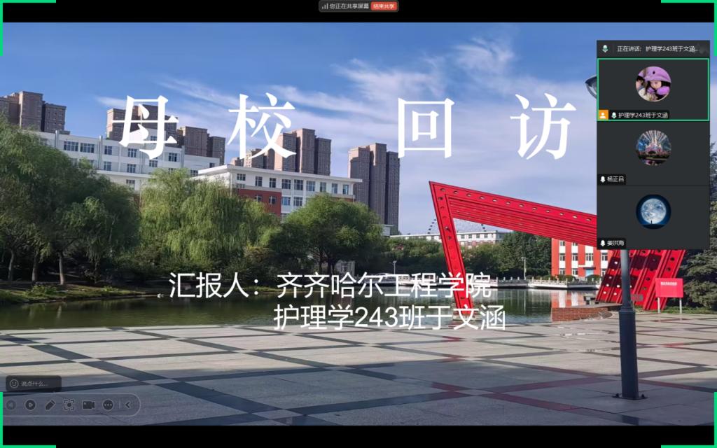 这次线上回访,不仅让我再次感受到母校的温暖,也让我意识到,作为一名大学生,我有责任将这份温暖传递下去。通过分享自己的经历,我希望能够激励学弟学妹们努力学习,不断进取,为未来的大学生活做好准备。同时,也更加坚定了我珍惜当下、努力学习、为母校争光的决心。