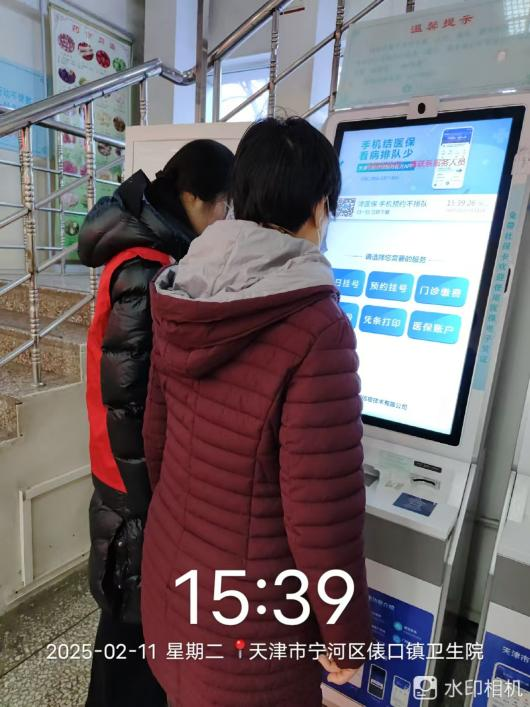 当日下午,卫生院内,一位身穿红马甲的志愿者格外引人注目。在自助服务机前,她正耐心细致地协助一位身着紫色棉衣的女士操作机器。屏幕上显示着“手机结医保,看病排队少”等提示信息,机器提供当日挂号、预约挂号、门诊缴费等多项服务。KH-087组崔欣蕾指着屏幕,向女士详细介绍各项功能,并不时点击屏幕进行示范,帮助女士完成所需的操作,尽显专业与负责。