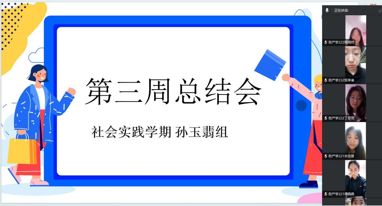 孙玉翡老师于1月24日19时30分在线上开展社会实践学期第三周总结会,会前,孙玉翡老师要求各组统计小组成员社会实践学期的完成情况。
