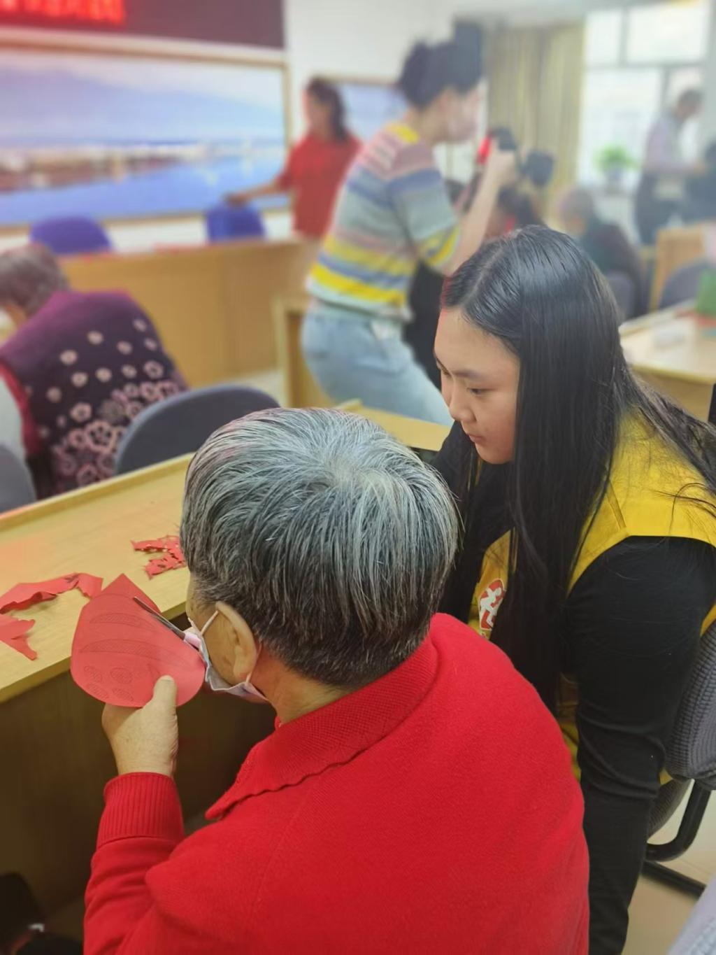 在剪纸过程中,欢声笑语回荡在整个房间。志愿者们与老人们亲切交谈,听老人们讲述过去的岁月、分享生活中的点滴趣事,大家唠着家常,其乐融融,浓浓的年味也在这温馨的互动中愈发浓厚。