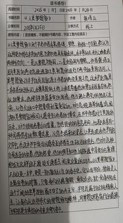 陈婷婷同学推荐了《人类梦想家》这本书。它引发社会思考,探讨了金钱与想象、科技与文化的关系,警示人们警惕科技带来的风险,思考人类未来走向;揭示社会本质,让我们看到美国社会“乌托邦”与“现实主义”的冲突,以及任何制度和社会都有两面性,帮助我们客观认识社会。