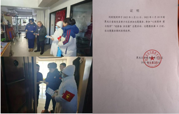 在2025年1月11日我参与了黑龙江省逊克县育才社区组织的“心放简单,爱与陪伴”的志愿活动,以及在2025年1月20日参与了“迎新春,共安康”的志愿活动。