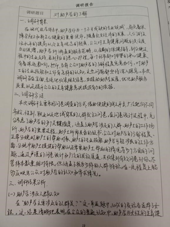 本次借助微信小程序发放问卷的调查方式,并明确了问卷内容涵盖助产学相关基础信息、公众认知程度等关键板块。此次调查虽规模不大,但涵盖人群广泛,涉及不同年龄、职业群体。问卷发布后,小组成员积极在社交平台、相关社群推广。最终收集到一定数量的有效问卷,为研究提供了宝贵数据。