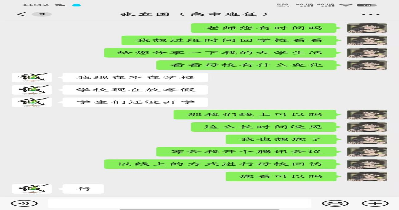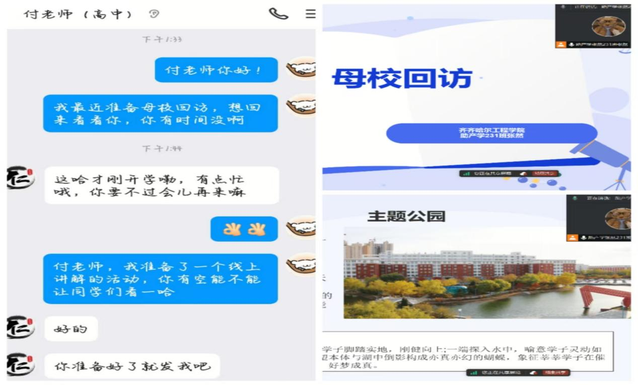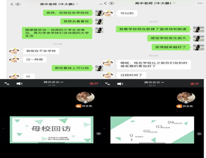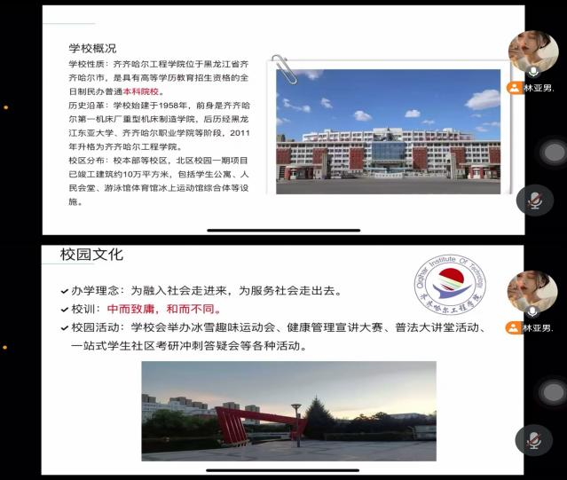 林亚男同学通过腾讯会议的形式进行母校回访,通过精心制作的PPT,向学弟学妹们全方位展示了齐齐哈尔工程学院的校园风貌、学科特色、师资力量等,让他们对大学生活有了更加直观的认识。