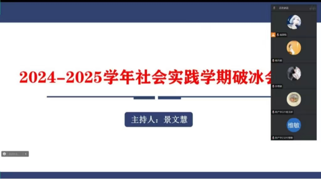 为使社会实践学期顺利进行,2025年1月7日晚上景文慧老师于腾讯会议召开了“2024-2025学年社会实践学期破冰会议”,KHX-317至KHX-321组18名同学参加。