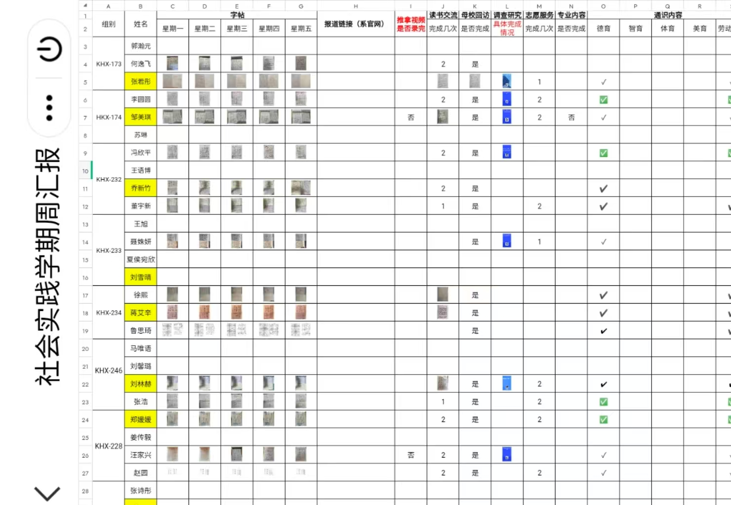 会议首先对每位成员的实践任务量进行了汇总和汇报。根据工作量表显示,KHX-173组的成员们在第三周完成了多项任务,包括社会实践志愿服务、字帖临摹、读书交流等活动,组内成员累计完成一次志愿服务,共临摹三本字帖。
