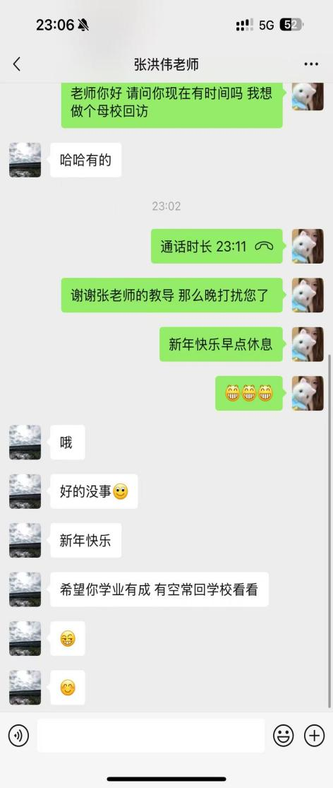 借助语音通话,她们向曾经的老师们送去了最诚挚的问候。交谈间,往昔的点点滴滴如潮水般涌上心头,那些青涩的岁月仿佛就在昨天。她们兴高采烈地分享着大学生活,从专业课程的学习心得,到丰富多彩的社团活动,再到校园里发生的奇闻趣事,每一个话题都饱含着我们对成长的感悟和对未来的憧憬。在欢声笑语中,时间悄然流逝,不知不觉间,回访已接近尾声。