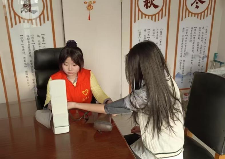 每天早上,她都会准时来到卫生院,协助医护人员为患者量血压、测血糖。她耐心细致,每一个步骤都认真操作,遇到年纪大的患者,还会轻声细语地安抚,让他们不要紧张。量完血压血糖后还会认真记录数据,并向患者解释各项指标的意义,提醒他们注意日常的饮食和作息。