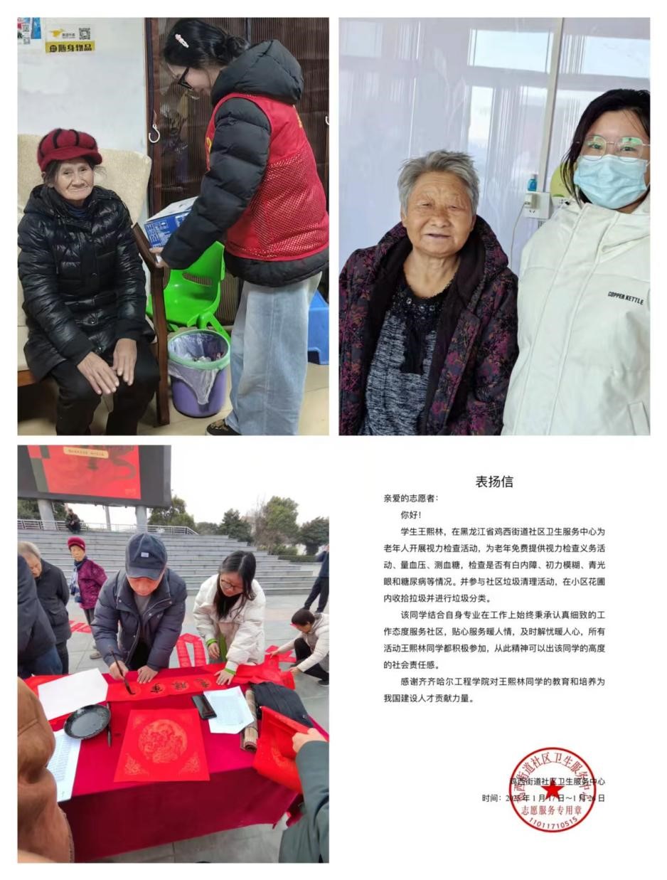 健管221班王熙林同学于2025年1月25日获得社区表彰,该同学在社区中多次参加健康科普活动,前至老年人家内为其进行基础的健康检查,为老年人普及健康的必要性以及打扫卫生,工作态度温和近人,值得表扬。