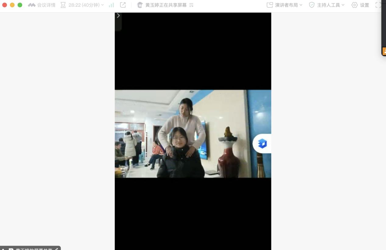 会议伊始,曲官雪老师首先对整个社会实践学期进行了简单的阐述。紧接着吴寒同学首先利用PPT内容对自己的社会实践学期工作量进行了汇报,其包括对字帖临摹的完成度、母校回访的进展、两次志愿服务活动的完成度和调研报告的完成情况。其用PPT讲解的内容清晰明了。随后,黄玉婷同学展示了自己推拿作业的视频,更高程度地展示了来自康复治疗学专业同学的专业程度。然后,钟耀祖同学就社会实践学期提出了自己的疑问,曲官雪老师也一一解答。最后,此次线上腾讯会议以曲官雪老师的总结圆满结束。