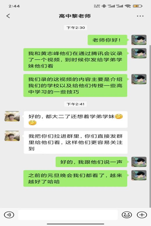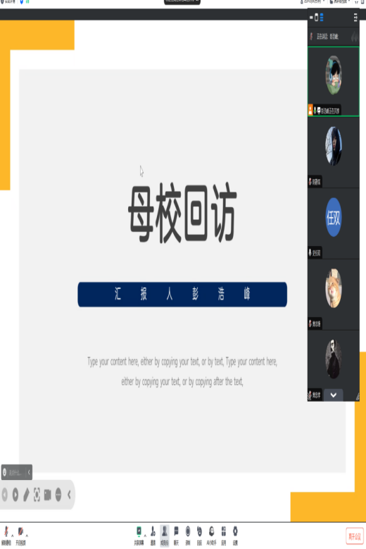 线上回访活动在腾讯会议平台准时开启。首先,我和其他校友依次进行自我介绍,分享了自己从母校毕业之后的求学经历和成长故事。在讲述的过程中,那些高中时光的美好回忆也不断涌上心头,而我生动的讲述似乎也勾起了大家对高中生活的怀念,同时也让学弟学妹们对大学生活充满了向往。在分享环节,我着重介绍了我所在大学的特色专业、校园文化以及丰富多彩的社团活动。我用自己的亲身经历,为学弟学妹们描绘了一幅多姿多彩的大学生活画卷,希望能让大家对未来的大学生活有更清晰地认识。