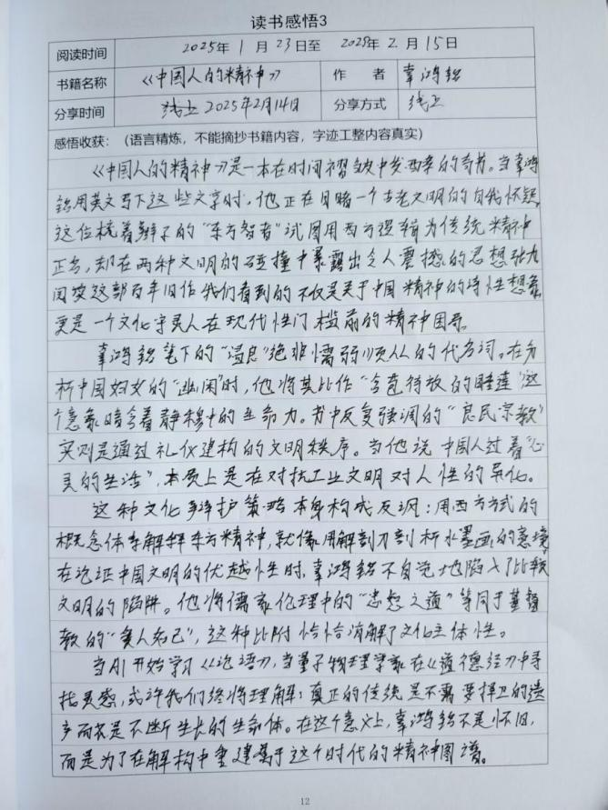 会议开始时,我们简单寒暄几句之后,便开始了读书交流。首先,张艳萍同学分享了《假如给我三天光明》这本书,说它让她明白了虽然在生活中有很多的不如意,但是只要我们不放弃自己愿意相信自己就一定能成功,就一定可以做的很好;其次,温贞民同学读了《中国人的精神》,他说 书中强调的"温良"品格,在当代语境中不应是固化的道德符号。当我看到支教青年用现代教育理念激活乡村活力,当国潮设计让传统纹样焕发新生,这种文化精神的传承早已超越简单的礼教复刻,而是转化为流动的创造力。真正的文化自信,或许正在于既能读懂青铜器上的饕餮纹,也能在数字代码中书写新的文明密码。