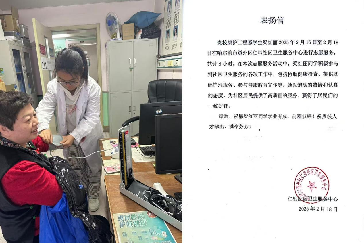为响应社会实践学期学校号召,增强居民的健康意识。KHX-022组成员梁红丽于2025年2月16日至2月18日在哈尔滨市道外区仁里社区卫生服务中心进行志愿服务。