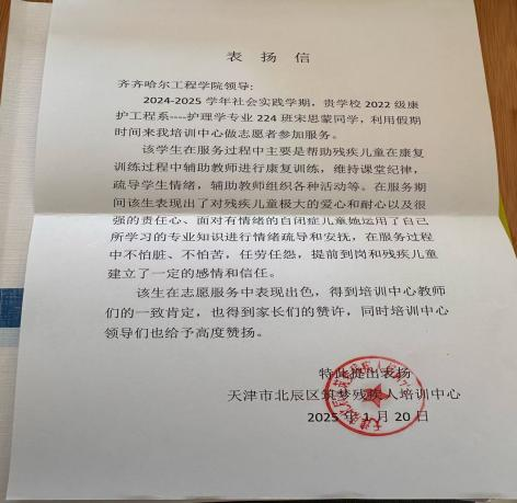 宋思蒙同学,在参与帮助特殊儿童的志愿服务过程中,走进了一个充满爱与希望,却又常被忽视的世界。宋思蒙同学负责协助老师为孩子们进行康复训练。她真切地体会到,特殊孩子们,每一个小小的进步背后,都饱含着无尽的努力和坚持。这段志愿服务经历,让她收获的远比付出的更多。学会了包容与接纳,懂得了生命的多样性和珍贵性。这些特殊的孩子们,用他们的纯真和坚韧,教会了我们如何用心去感受生活,如何在平凡中发现美好。