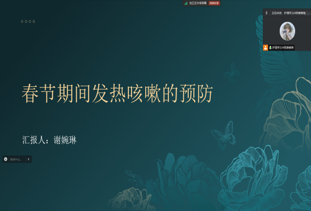 谢婉琳同学在社会实践学期进行了健康宣讲和打扫卫生所的志愿活动,由于春节期间流动人口剧增,许多人出现了发热、咳嗽等症状,通过腾讯会议的线上方式对当地居民进行健康宣教,谢婉琳同学凭借其扎实的专业知识和热情的服务态度,受到了大家的高度评价。在宣讲过程中,谢婉琳同学用通俗易懂的语言,向听众们介绍了发热和咳嗽的预防、护理方法以及科学饮食健康生活的重要性。此次志愿服务深刻体会到健康知识普及的重要性,接下来也会为传播健康知识、提高公众健康水平贡献自己的力量。