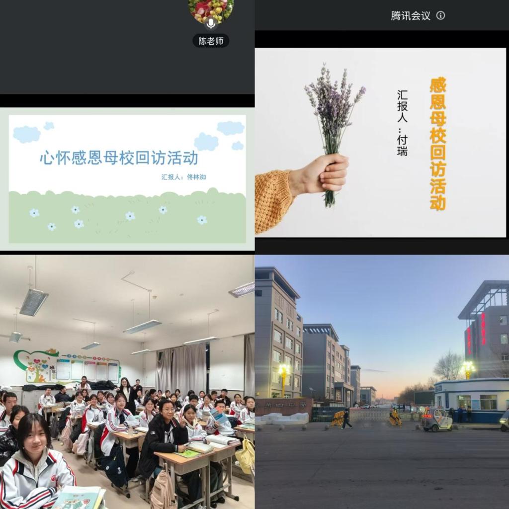 由于春节假期,我们通过线上的方式与母校老师进行联络,感谢老师们的辛勤付出让我们取得了理想的成绩,走上了更为广阔的发展平台。2月25日上午,佟林洳和付瑞同学分别与老师视频通话线上会议形式,与老师共同回忆在校的难忘生活,谈及母校的变化,并分享了自己上大学之后的所见所闻,感谢老师的照顾与帮助,同时表达了对老师的想念;刘欣誉和胡家莹同学怀着对母校的思念再次踏入校园,介绍了大学的基本情况和所学专业的特色,还分享了在大学生活中学到的许多知识和经验,并根据专业所学与老师分享了如何吃的更健康。
