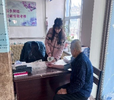 张馥睿来到富拉尔基区养老中心。在这里,她秉持着敬老恤弱的原则,积极开展志愿服务活动。为老人们测量血压时,她手法娴熟、动作轻柔,每测完一位老人,都会耐心地为他们讲解血压数据代表的健康意义。并通过健康宣教内容,围绕老年人常见疾病的预防和日常保健知识,用通俗易懂的话语为老人们进行科普。她的到来让养老中心充满了温馨与欢乐。