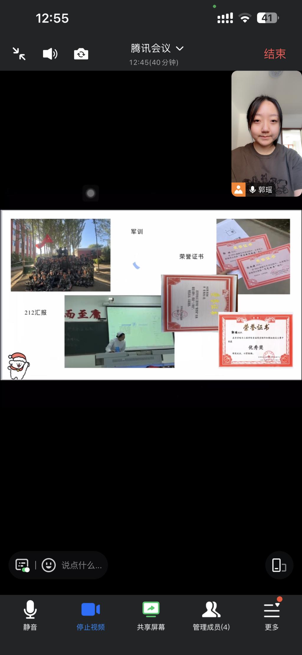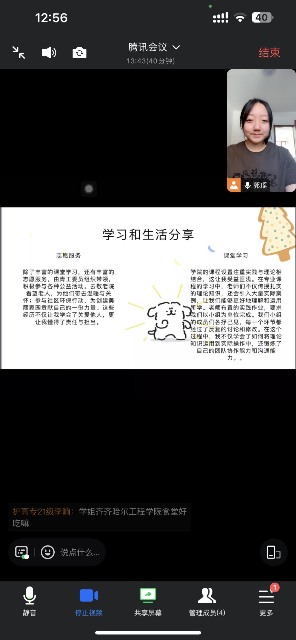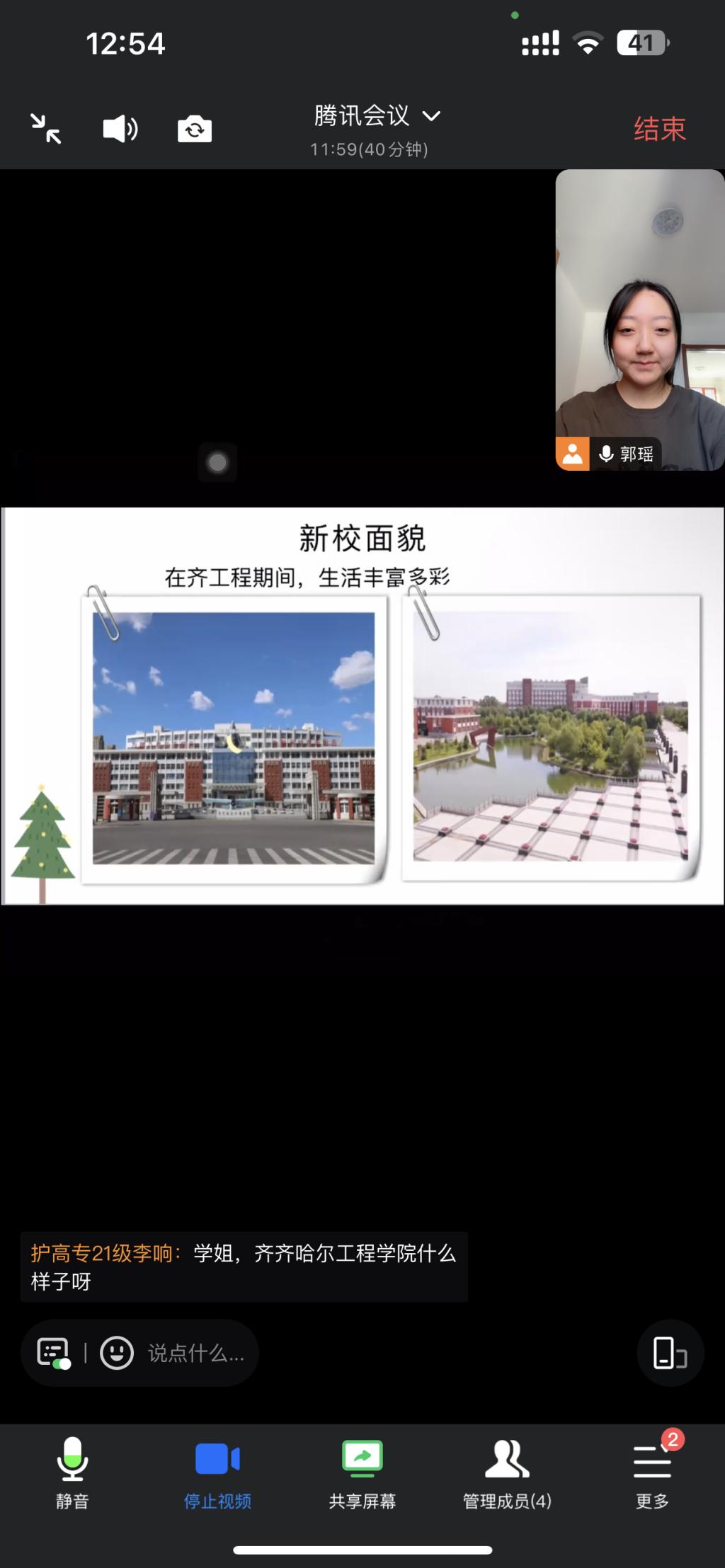 怀着对母校的深切眷恋与成长沉淀的满满收获,我以线上会议的形式,开启了这场跨越校际的温情回访,与昔日恩师、学弟学妹们再度“重逢”。一接通连线,我认真地向老师们汇报自己在本科阶段的成长。并讲述了学校设备先进、功能齐全的护理实训室,模拟真实的医疗场景,让我们在实践操作中不断提升专业技能。以及形式多样的志愿者服务活动,则让我们将所学知识运用到社会公益中,传递爱心与温暖。最后详细介绍了齐工程富有特色的“212汇报”与校外课堂。