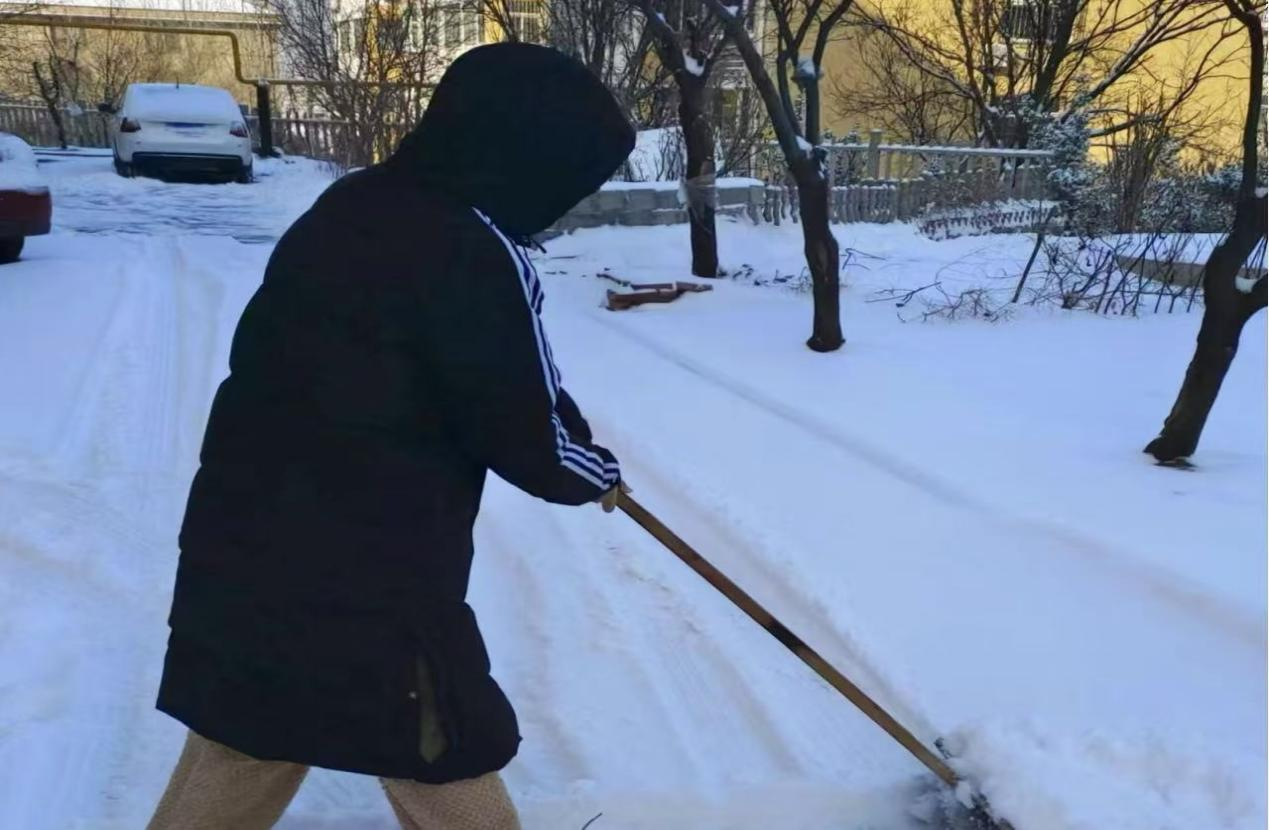 清晨,我就带着铁锹、扫帚来到社区街道。面对厚厚的积雪,他没有丝毫退缩,迅速投入到扫雪工作中。一铲一铲,将堆积的积雪集中,再用扫帚仔细清扫残留的碎雪,不放过任何一个角落。尽管寒风刺骨,双手被冻得通红,我依旧干劲十足,一心想着尽快为大家开辟出安全的出行道路。