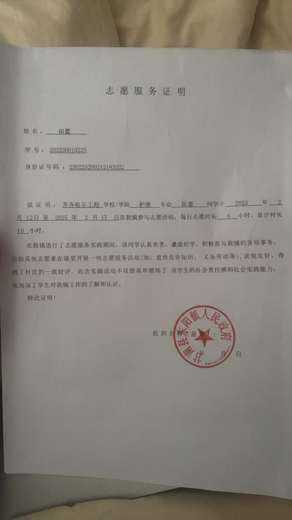我校田蕾同学,在 2025 年 2 月 12 日至 17 日期间,参与志愿活动。每日 8 小时,总计 40 小时的服务时长里,她积极宣传反诈知识、参与义务劳动,得到村民一致好评。