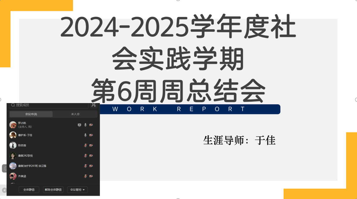 本周标志着社会专业实践学期的尾声,为了回顾和总结本学期的实践成果,分享宝贵经验,我们的小组于2025年2月27日通过腾讯会议平台成功举办了第六周的周总结线上会议。