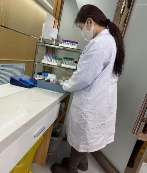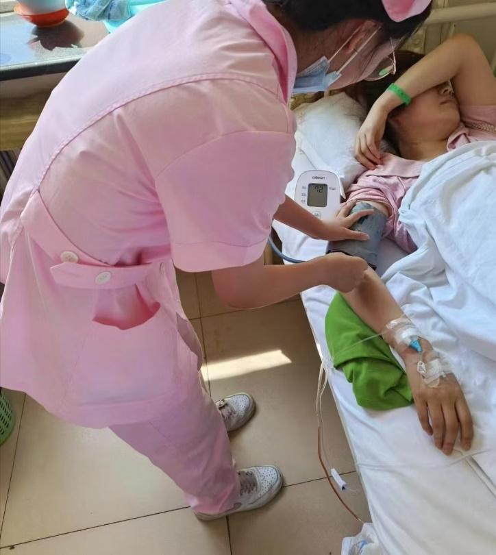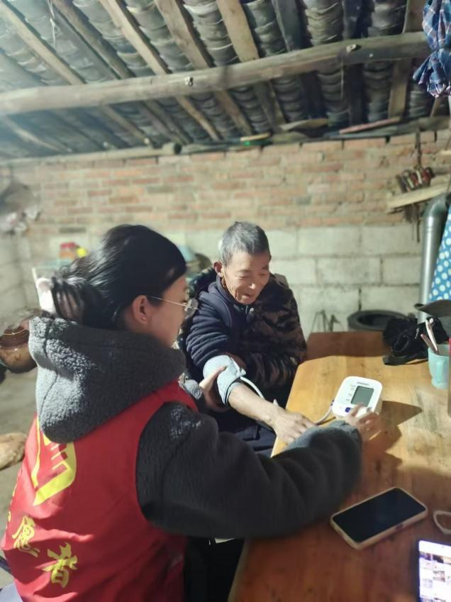 助产学231班张然同学与当地的白鹤林社区的其他志愿者在社区进行义诊活动,主要工作是为就诊人员测量血压。