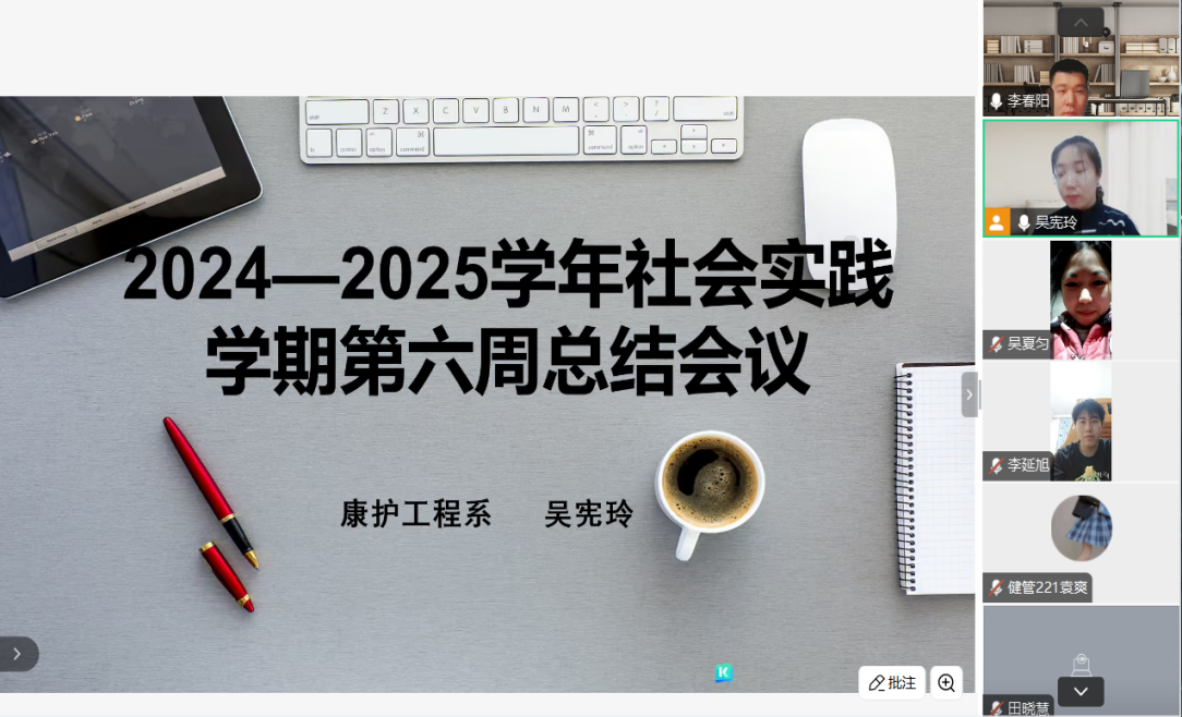 吴宪玲老师于2025年2月27日在腾讯会议召开了社会实践学期的第六周总结会议。此次会议主要对健管专业22、23级和康复24级同学的社会实践学期总体完成度完成情况和收获进行总结。