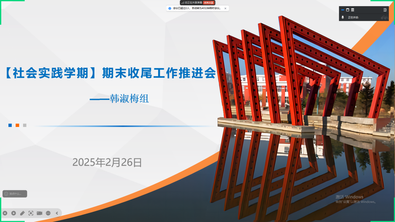 2025年2月26日晚间19:00,康护工程系生涯老师韩淑梅通过线上会议的形式,成功组织召开了KHX-209、KHX-210、KHX-211、KHX-212四个小组的社会实践学期期末收尾工作推进会。本次会议旨在全面总结上一阶段同学们在社会实践学期中的表现,进一步督促同学们加快学习任务进度,确保实践学期的顺利推进。