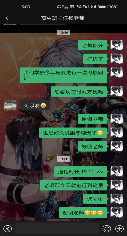 由于学校处于寒假期间,吴姗珊同学采用了线上方式进行母校回访活动,于2月20日通过微信电话这种方式与母校班主任进行访谈,问候班主任,回望过去,展望将来。