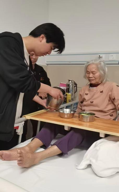 我们走到每一位老人的床边,将午餐递到他们手中,并细心地为他们打开餐盒,摆放好餐具。一位老奶奶接过饭菜,笑着说:“真香啊!谢谢你们,孩子们。”我蹲下来,陪他聊起了家常。老奶奶告诉我,他因为身体原因不能回家过年,但看到我们来了,他觉得自己并不孤单。