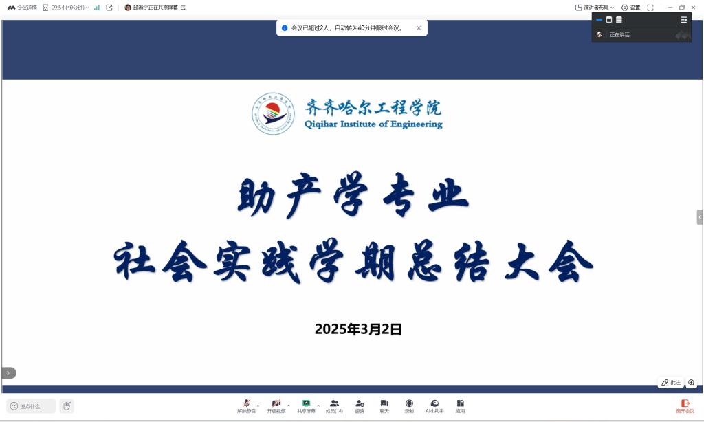 为确保本次社会实践学期各项工作顺利收官,全面梳理和总结经验与成果。2025年3月2日,助产学专业组织开展了“助产学专业社会实践学期总结大会”。此次会议由孙名序老师主持,助产学专业生涯导师和辅导员参会。