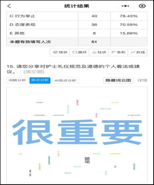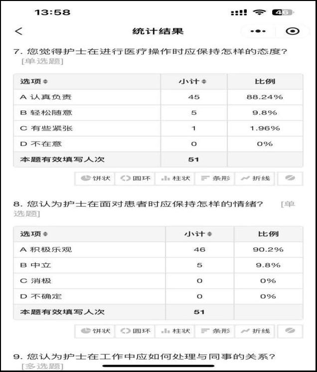 张杰舒同学的调研目的是为了解护士礼仪规范和职业道德的现状,包括护士在仪容仪表、言谈举止、行为礼仪、职业道德等方面的表现,采用问卷调查法。调查结果显示,护士们在礼仪规范和职业道德方面具有一定的素养,但在某些方面仍存在不足。例如,在沟通技巧方面,护士们可能需要改进语气和态度,以更好地满足患者的需求;在职业道德方面,护士们需要对患者隐私保护给予更多的关注和尊重患者权利。提升护士的综合素养是提升护理服务质量的关键。