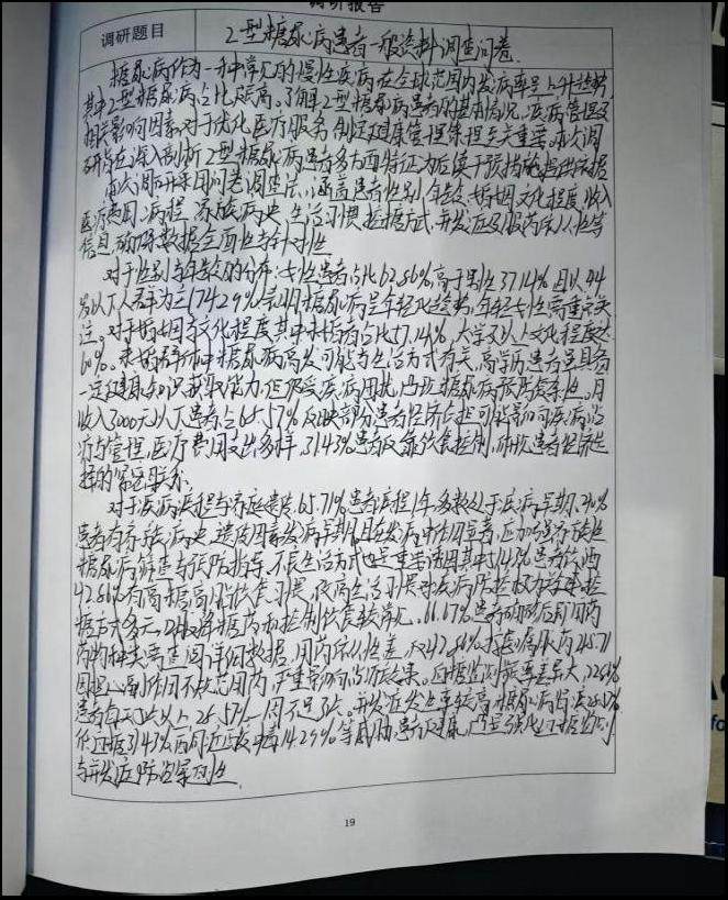 刘远俊同学做了关于2型糖尿病的调研,2型糖尿病作为常见慢性病,严重影响患者生活。本次调研聚焦此类患者,旨在全面了解其健康状况与需求。通过线上问卷与线下访谈,收集了200位患者数据。结果显示,超70%患者患病5年以上,多数靠药物与胰岛素控糖。饮食运动方面,仅30%能严格遵循医嘱,多数因工作忙、缺乏指导难以坚持。近40%患者表示心理压力大,源于疾病管理负担和并发症担忧。这些数据凸显出加强患者教育、优化医疗支持及关注心理健康的重要性。