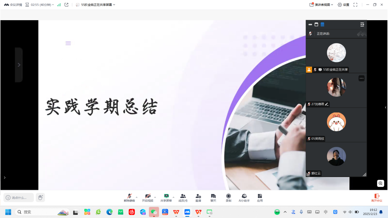 在社会实践学期将要结束时,最后召开了总结会议,并且是整个学期的总结会议,在会议上先由小组长发言,对本次的社会实践学期进行一个总结,再由小组成员依次总结各自的社会实践完成情况,也对小组长的付出表示肯定以及感谢。
