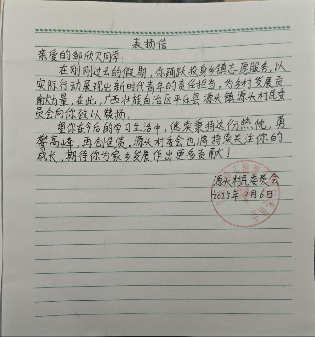 村委会工作人员表示,邹欣贝的到来,为村委会日常工作带来极大便利。她对待工作认真负责,面对村民热情友善,展现出当代大学生的良好风貌。为感谢邹欣贝的辛勤付出,源头村民委员会特地向她颁发表扬信,赞扬她无私奉献的志愿精神。