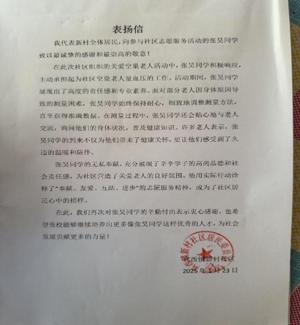 此次活动不仅为空巢老人提供了实际的帮助,也营造了社区关爱老人的良好氛围。新村社区对张昊同学的辛勤付出表示衷心的感谢,并希望未来能有更多像张昊同学这样优秀的人才,积极参与到社区志愿服务中来,为社会发展贡献更多的力量。