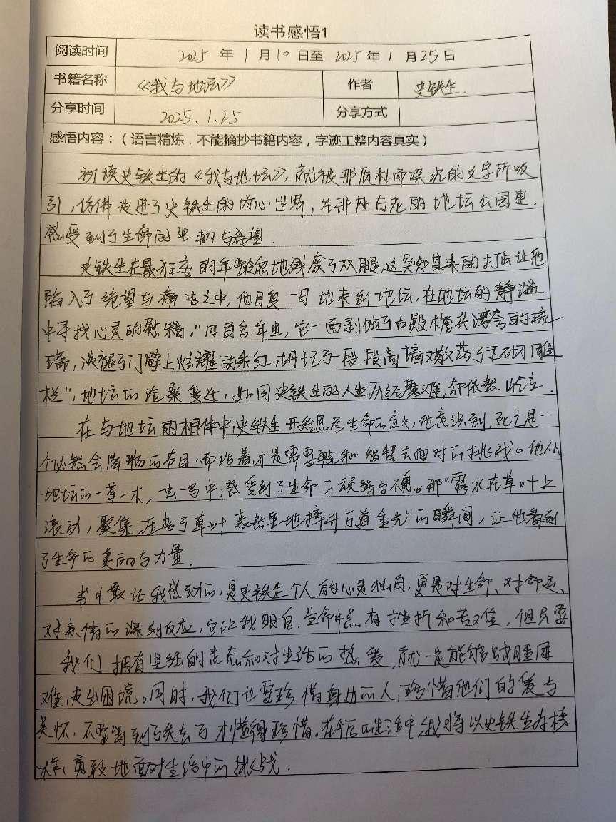 《我与地坛》不仅仅是史铁生个人的心路历程,更是对每一个在生活中挣扎的人的鼓舞。它让我们明白,生命的美好并不在于一帆风顺,而在于在挫折中依然能坚守希望,在苦难中依然能发现生命的微光。我们应当像史铁生一样,在困境中保持对生活的热爱,珍惜身边的每一份温暖,勇敢地去追寻生命的意义,书写属于自己的精彩篇章。