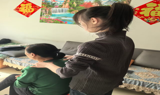 在按摩之前我和奶奶说按摩的手劲会有些大,可能会感到有一点疼。但奶奶却表示没关系。在得到回复后就展开了按摩的手法。期间还询问奶奶力度是否合适。按摩结束之后,奶奶说“这么捏一捏揉一揉的真舒服了不少”。随后再根据老人的生活习惯为她选取适合她的活动方式。