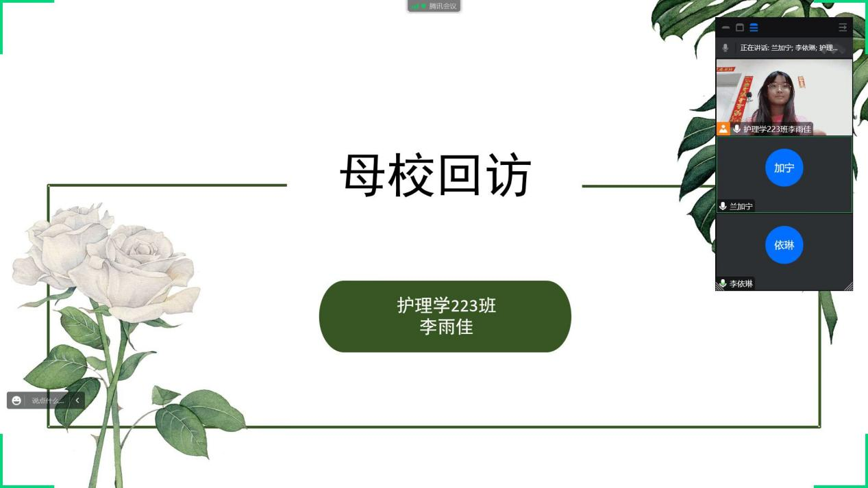 最后,李雨佳同学表达了对母校和老师的感恩之情,感谢母校的培养和老师们的辛勤付出。她鼓励学弟学妹们珍惜高中时光,努力学习,为梦想全力以赴。此次线上回访活动在热烈的氛围中圆满结束,不仅为学弟学妹们提供了宝贵的经验,也加深了校友与母校之间的情谊。